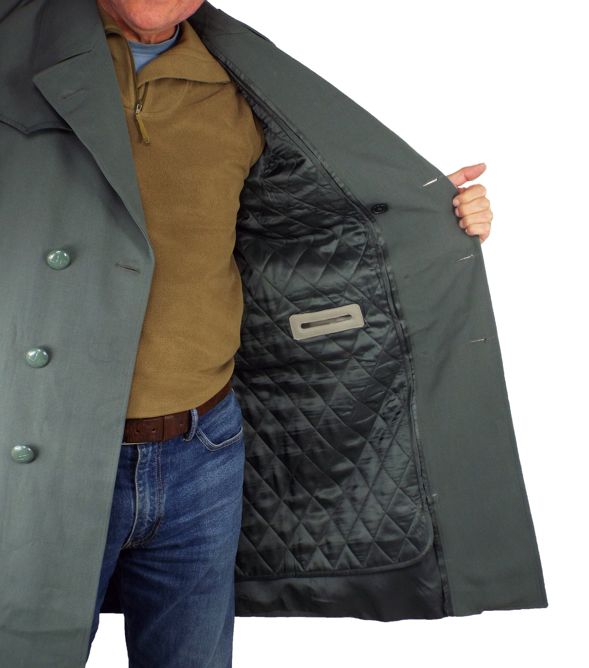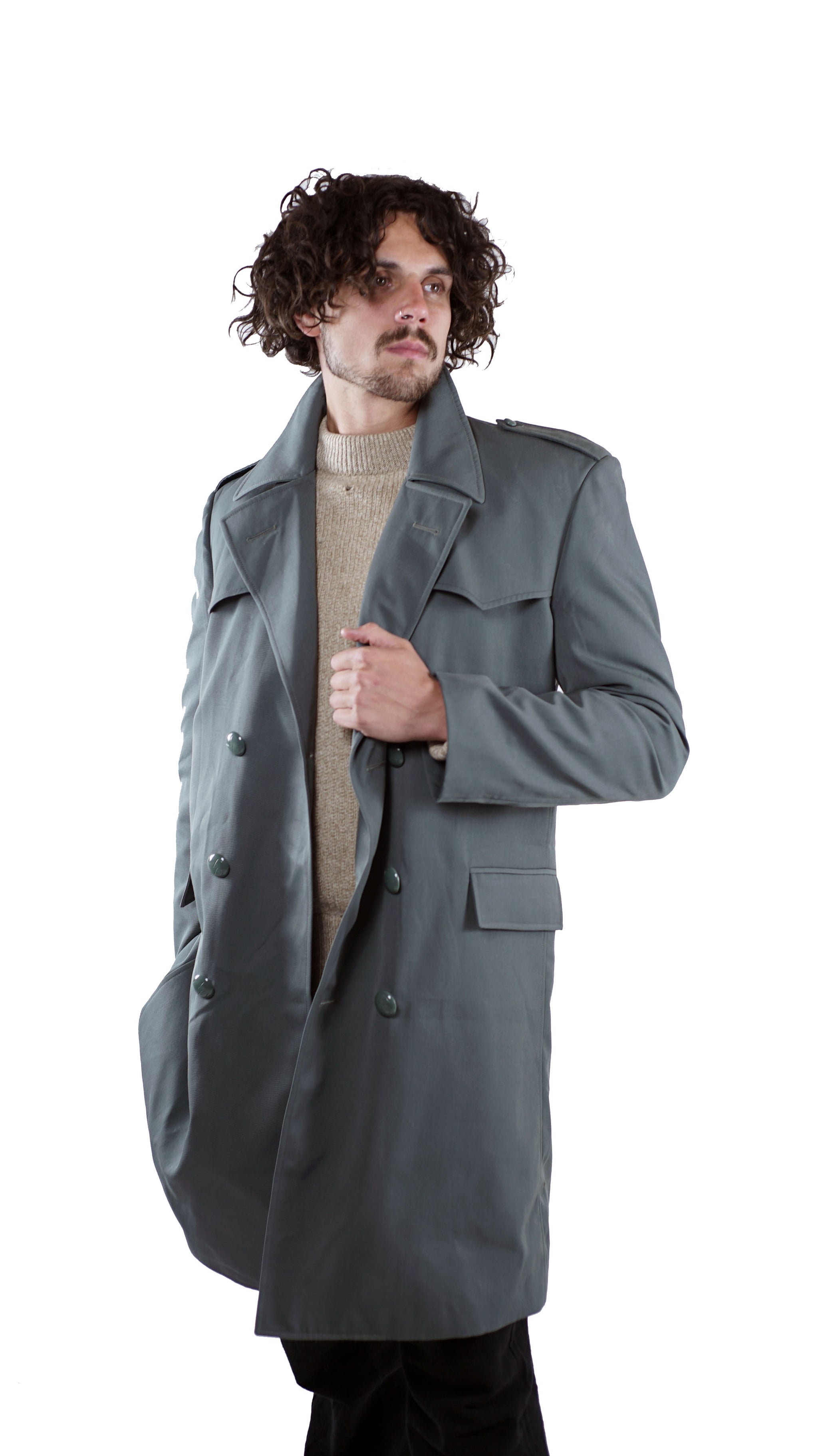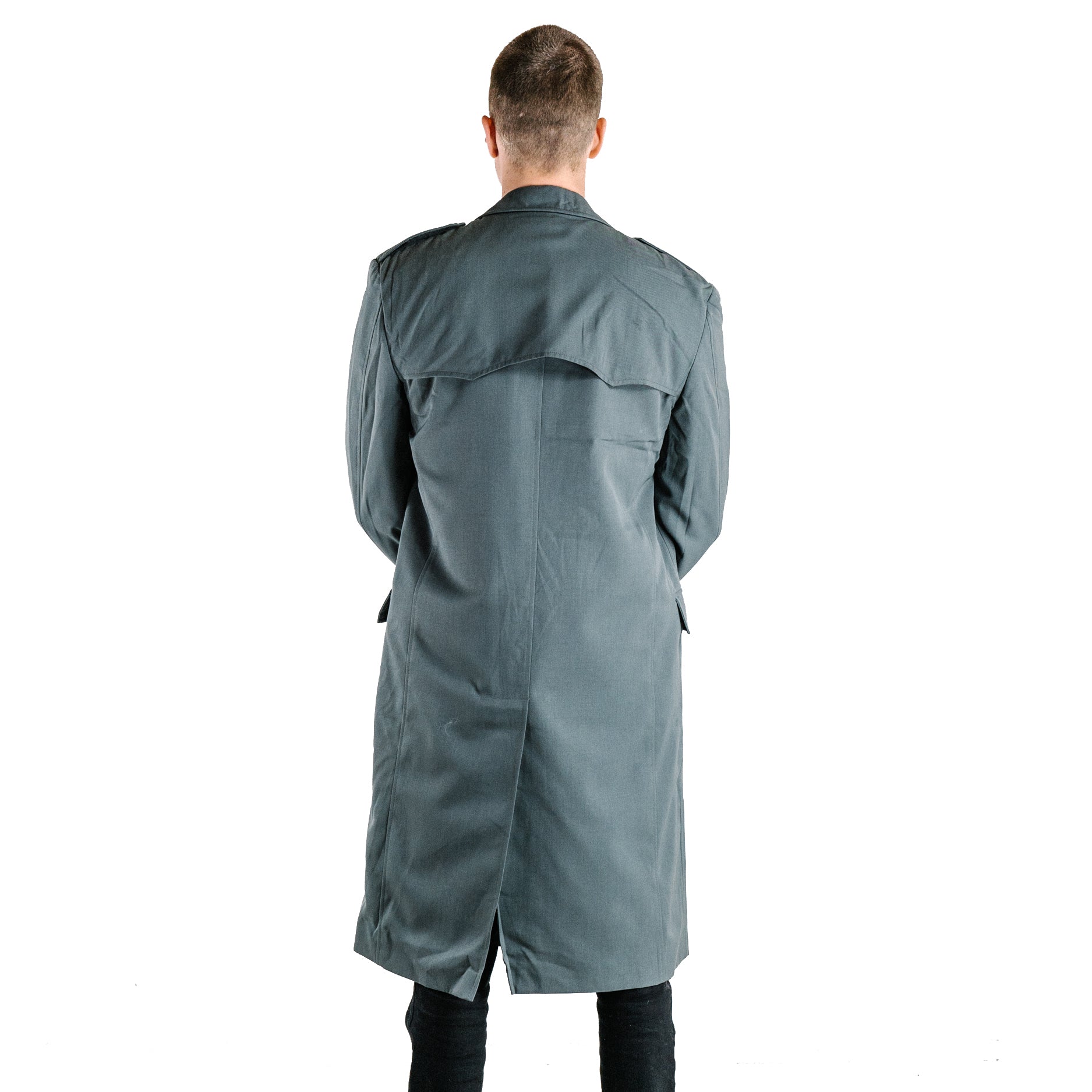 Stylish men's field grey (grey with blueish tinge) military trench coat originally from the Italian militarised police force Guardia di Finanza. Made from wind-proof gabardine woven cotton which is great for keeping heat in. These trench coats are a double breasted design with grey plastic buttons and shoulder epaulettes. Other features of this trench coat include: