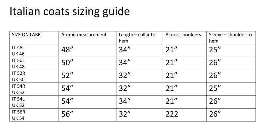 We list these coats as they are labelled as a Short (C), Regular height (R), Tall (L) or Extra Tall (XL). As a rough guide the drop lengths from the rear of the collar seam to the hem on these coats are approximately: