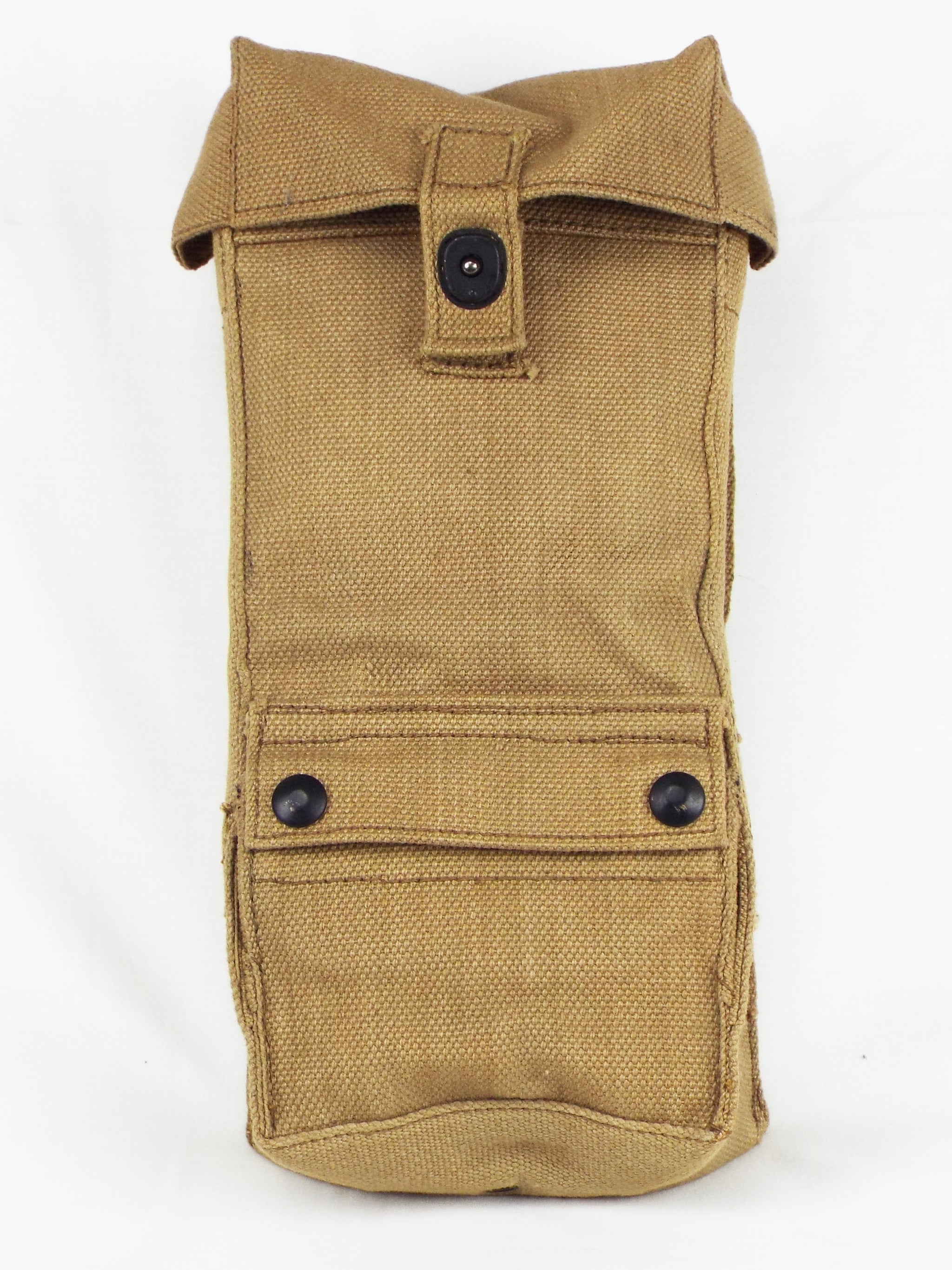 Genuine Danish Army webbing pouch in Pattern 37 format. The pouch is made of heavyweight sand-coloured canvas, and has rugged poppers for the closures, as well as loops and connectors for standard attachment to a 2" webbing belt.
