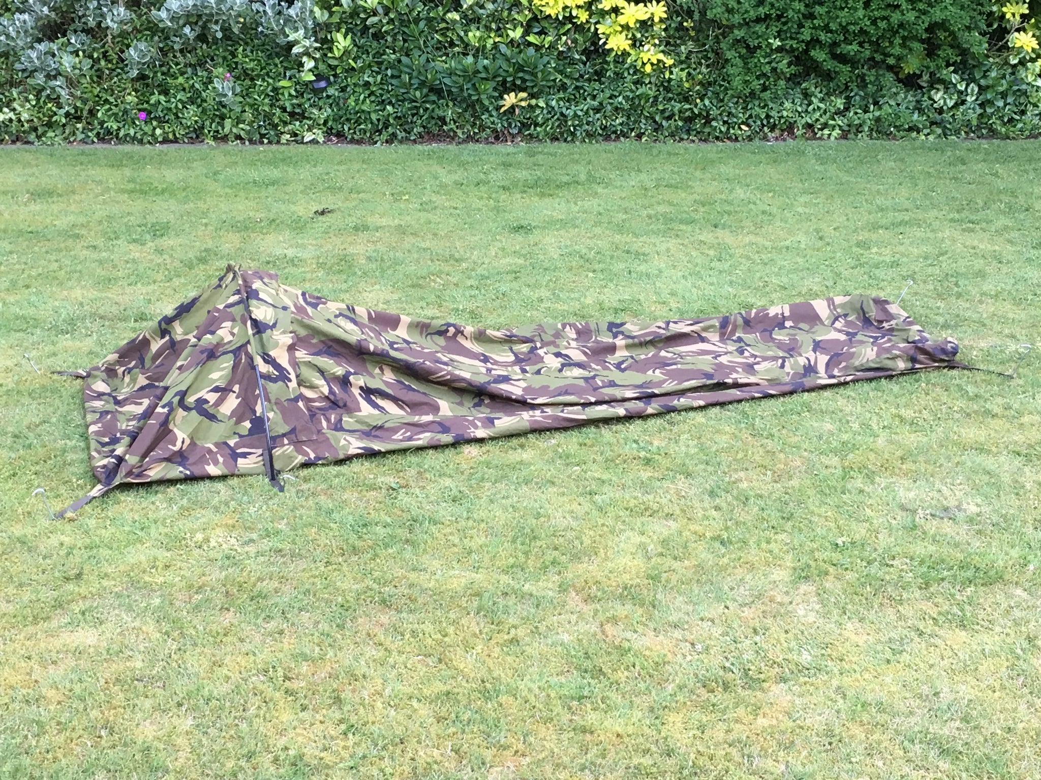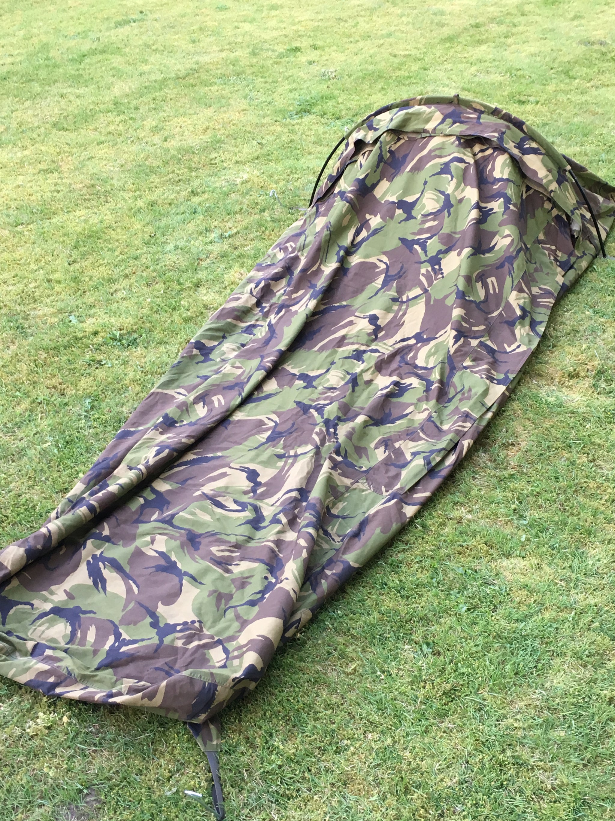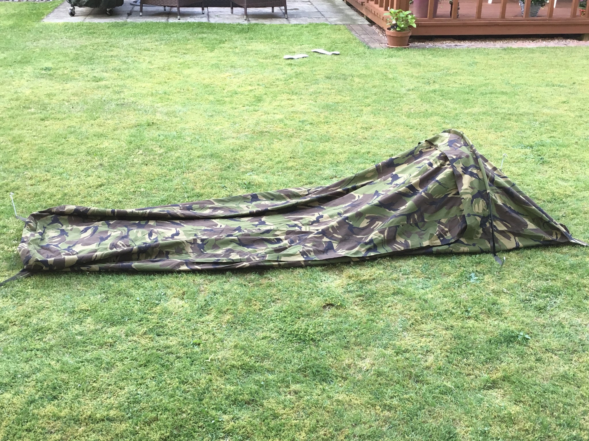 This genuine military bivvy bag comes in Dutch DPM woodland camouflage very similar to the British military, and comes complete with the sectional aluminium pole and pegs.