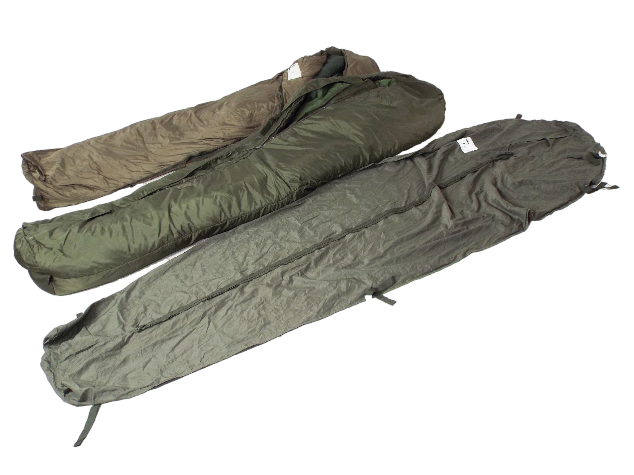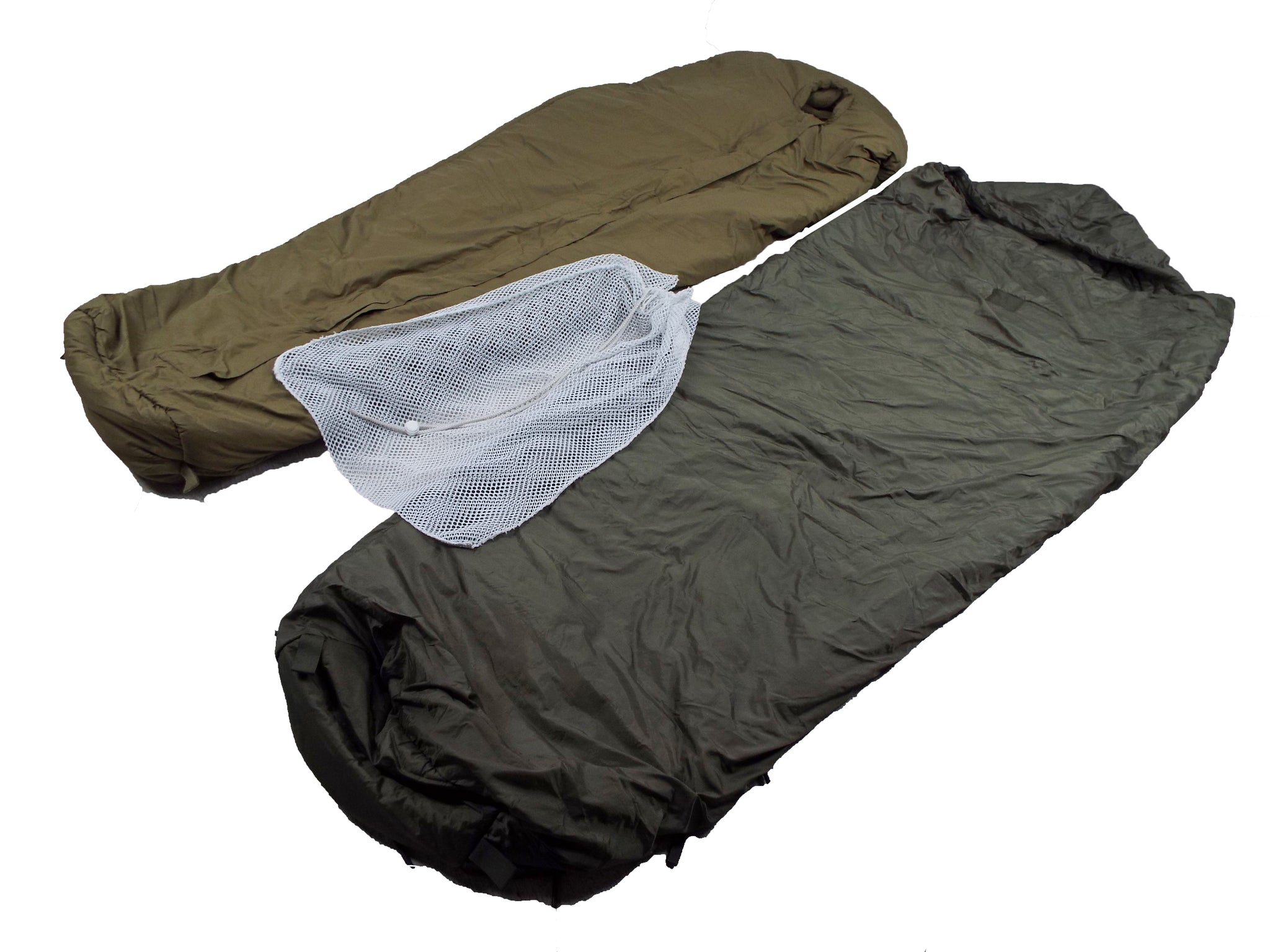 Both parts of the NATO modular system for all-weathers and supplied in Grade 1 condition. A true four-season sleeping bag arrangement with a string carry sack.
