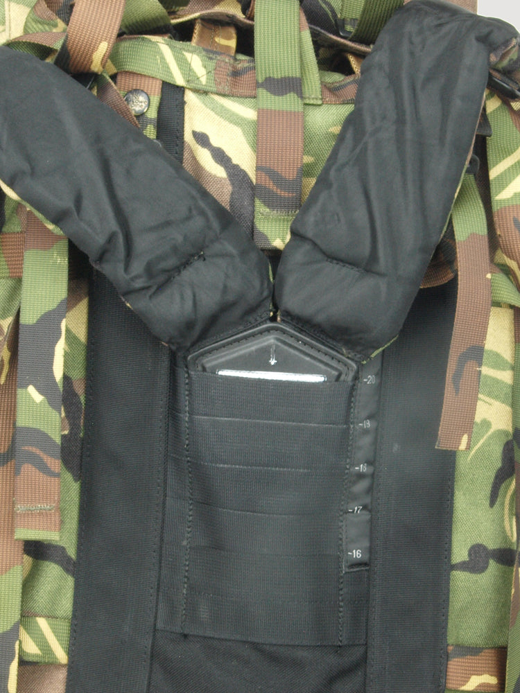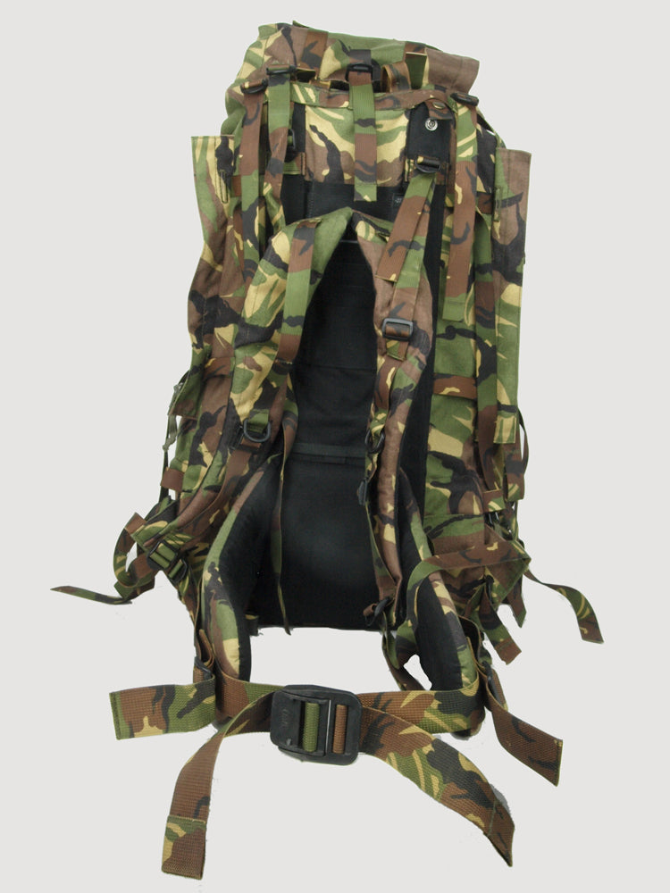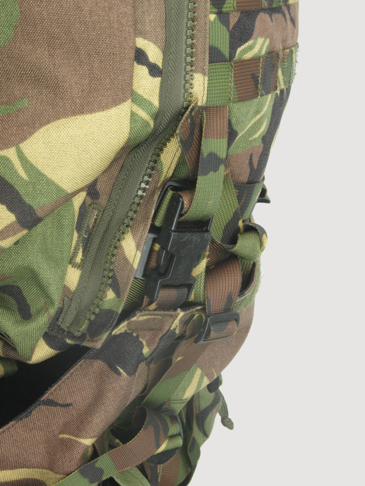 This Dutch army camo backpack/rucksack is made from durable and waterproof Cordura nylon material. It has a camouflage pattern very similar to British DPM and has a 60/70 Litre capacity. The main storage area is split into three compartments to easily separate and find kit. An identification pouch is on the back for travel documents.