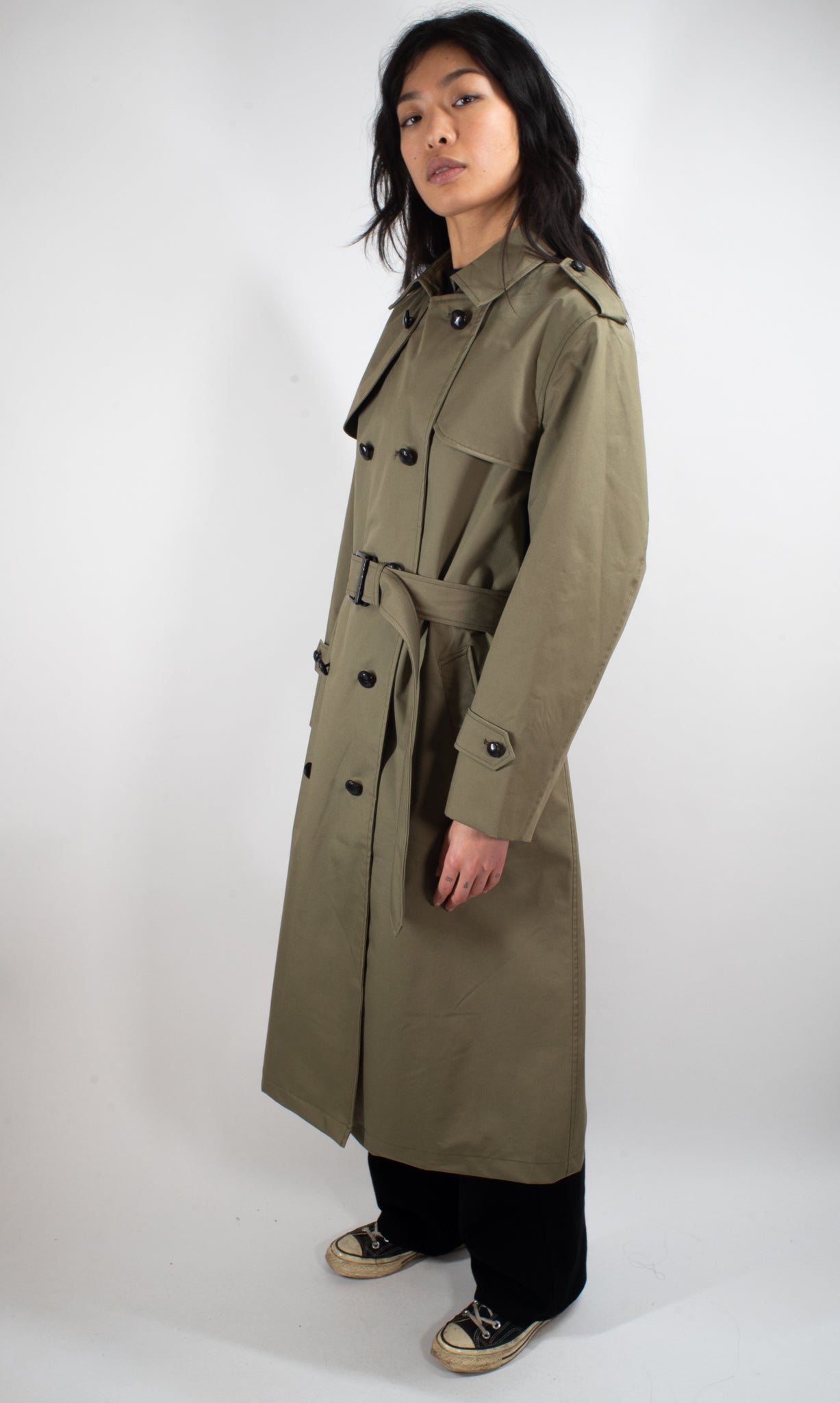 These Dutch khaki ladies' military trench coats are as good as, if not better than high street equivalents. They are made from a full length tight-weave (gabardine) polyester making them both wind-proof and waterproof. The coat also has additional waterproofing around the shoulder area in the form of a rubber backed cape.