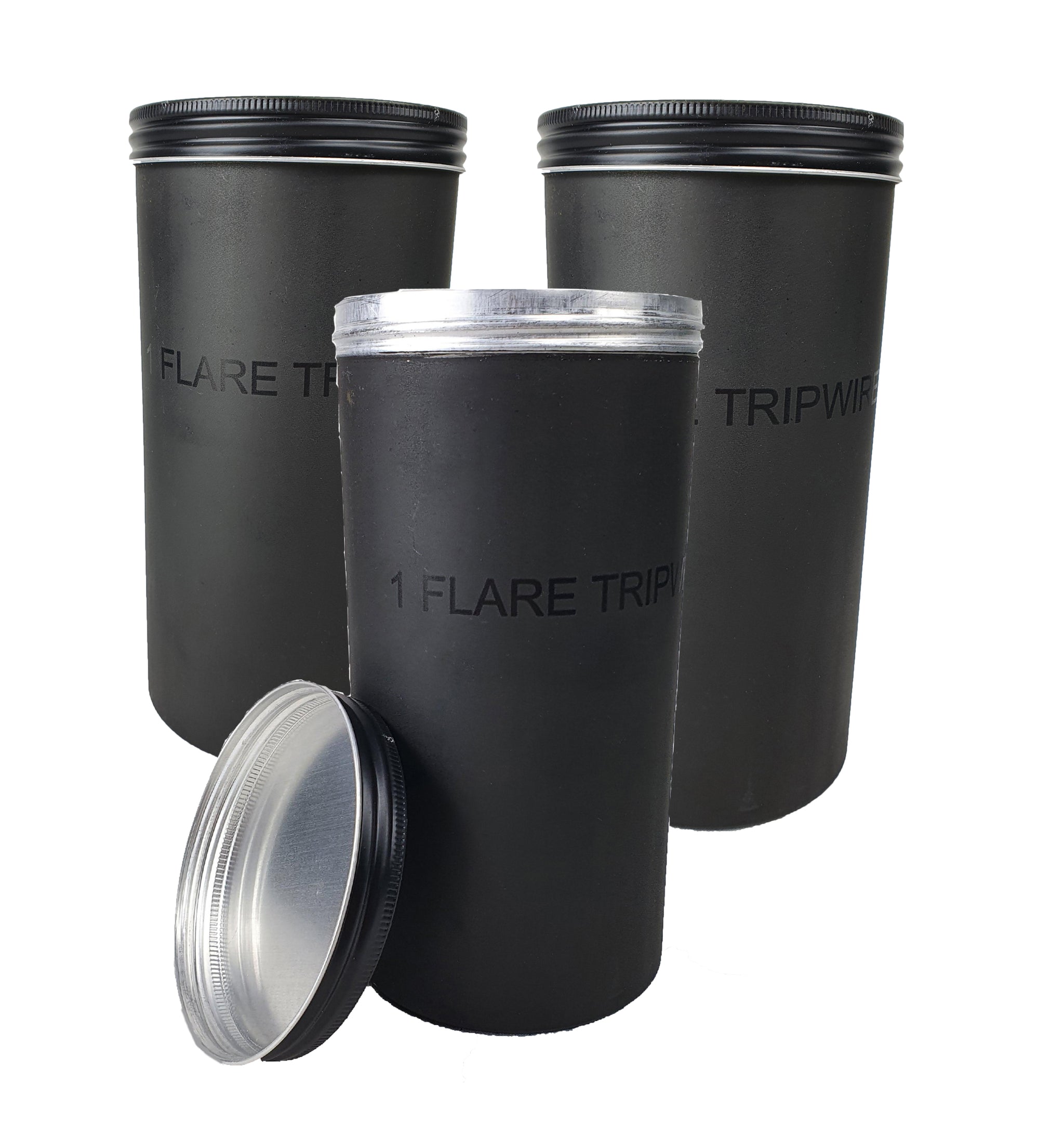 British Military Surplus Aluminium Flare Containers. These were originally designed to carry a British military flare tripwire. Non-reflective matte black exterior with a shiny aluminium interior. These are perfect for storing a multitude a things, including: Fishing accessories, Ammunition, Coffee etc.