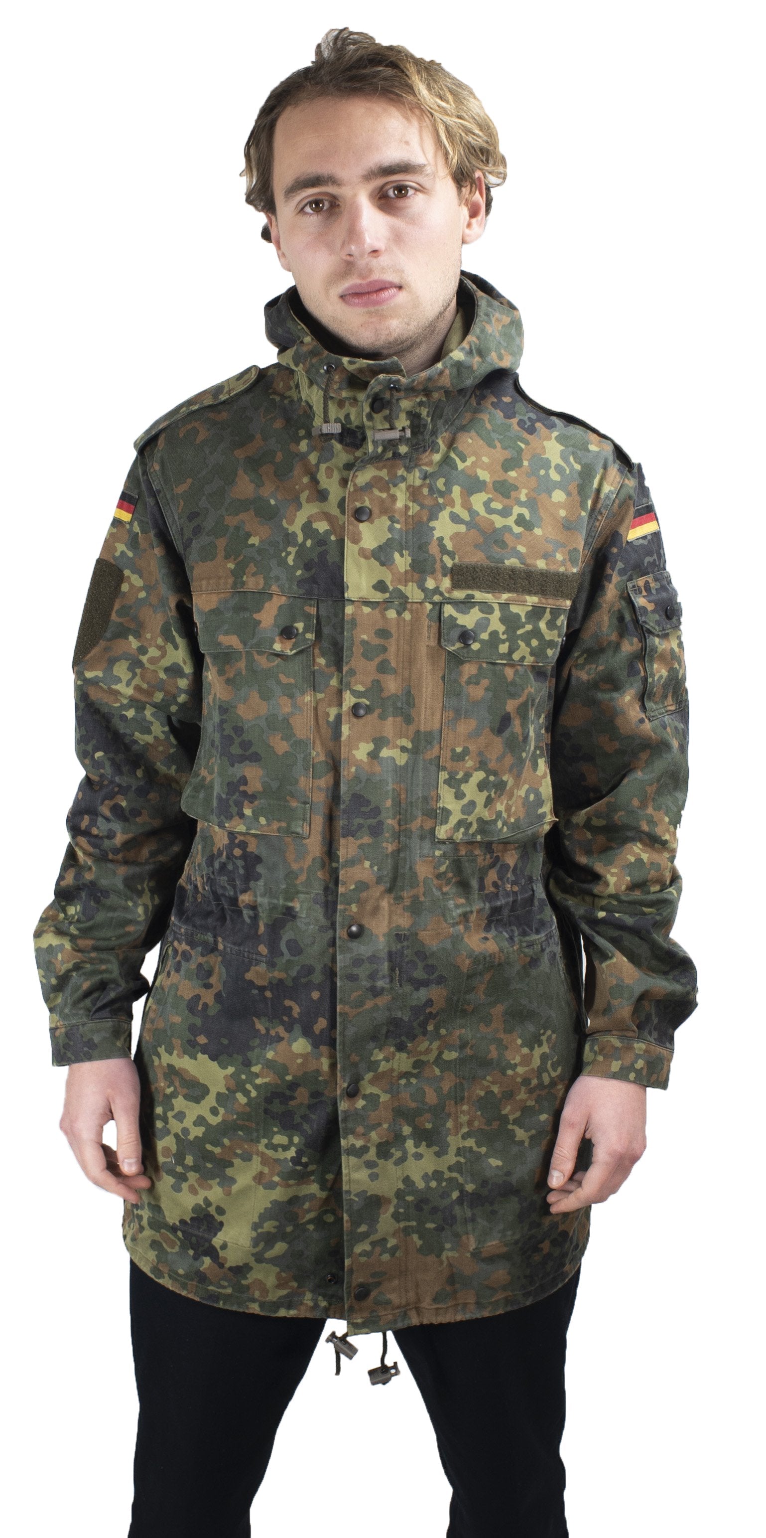 This German army flecktarn parka is a real military surplus classic and one of our most popular coats! They are genuine Bundeswehr issue so as you would expect they are built to last, made from heavy duty cotton in German five-colour flecktarn camouflage, a very distinctive and well performing camo pattern.