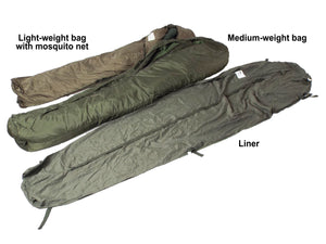 Both parts of the NATO modular system for all-weathers and supplied in Grade 1 condition. A true four-season sleeping bag arrangement with a string carry sack....
