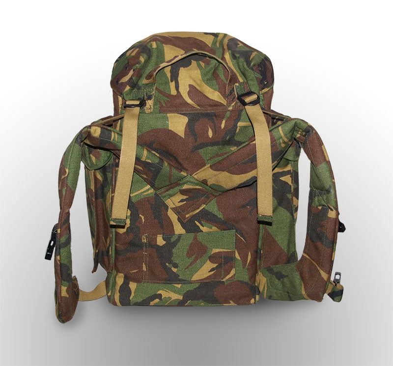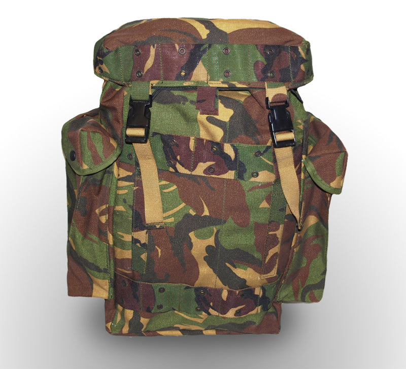 This army camo backpack/rucksack is made from durable and waterproof Cordura nylon material. It has a camouflage pattern very similar to British DPM and has a 35 litre capacity. The main storage area is split into three compartments to easily separate and find kit, it has two outer pockets secured with durable plastic clips and an identification pouch on the back for travel documents.
