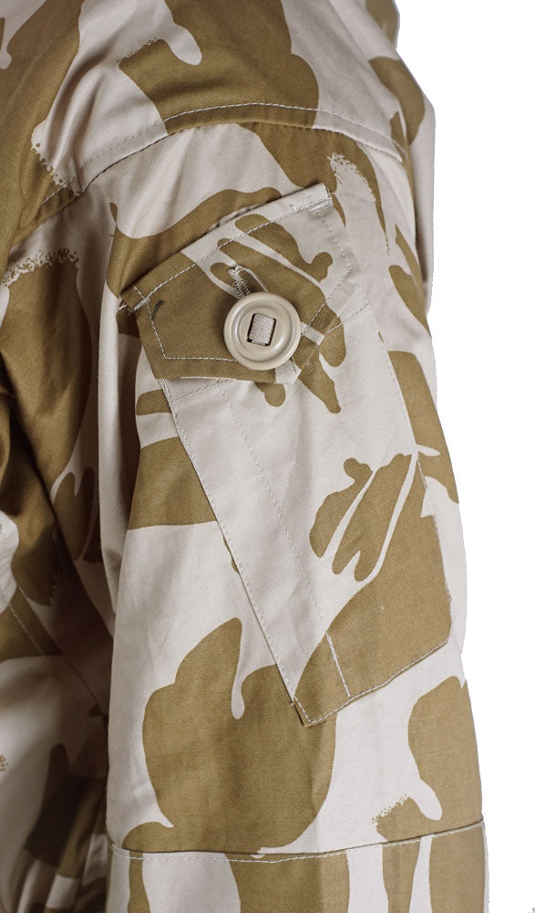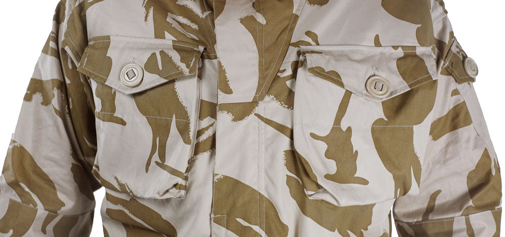 Brand new British desert windproof smock in two colour DPM desert camouflage - reproduction. These smocks are made from gabardine woven 100% cotton, providing a windproof shell and excellent heat retention. This reproduction desert combat smock is one of our best selling jackets and it is easy to see why. It has four large baggy pockets with toggle fasteners making it extremely practical, it also has two field pockets on either arm. There is a large windproof hood complete with drawstrings and is zip fastened with a Velcro wind flap.