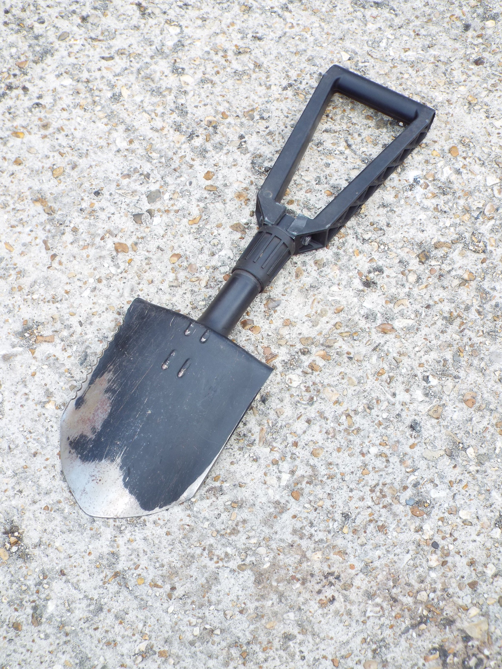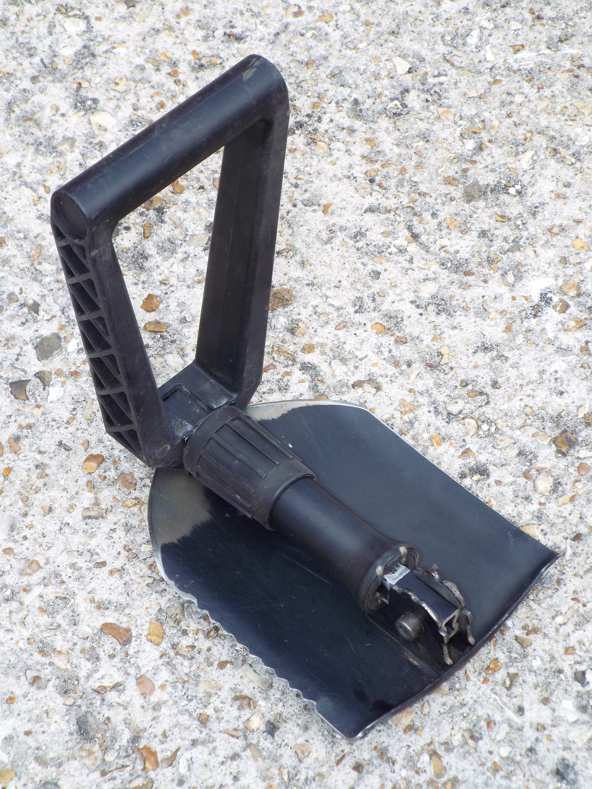 The shovel handle consists of two parts and a nylon screw lock that allows the shovel head to be locked in two different positions, or the entire shovel to collapse into a 3rd of its extended length. This makes the folding shovel very practical, easily stored and transported and ideal for camping or an emergency vehicle shovel.