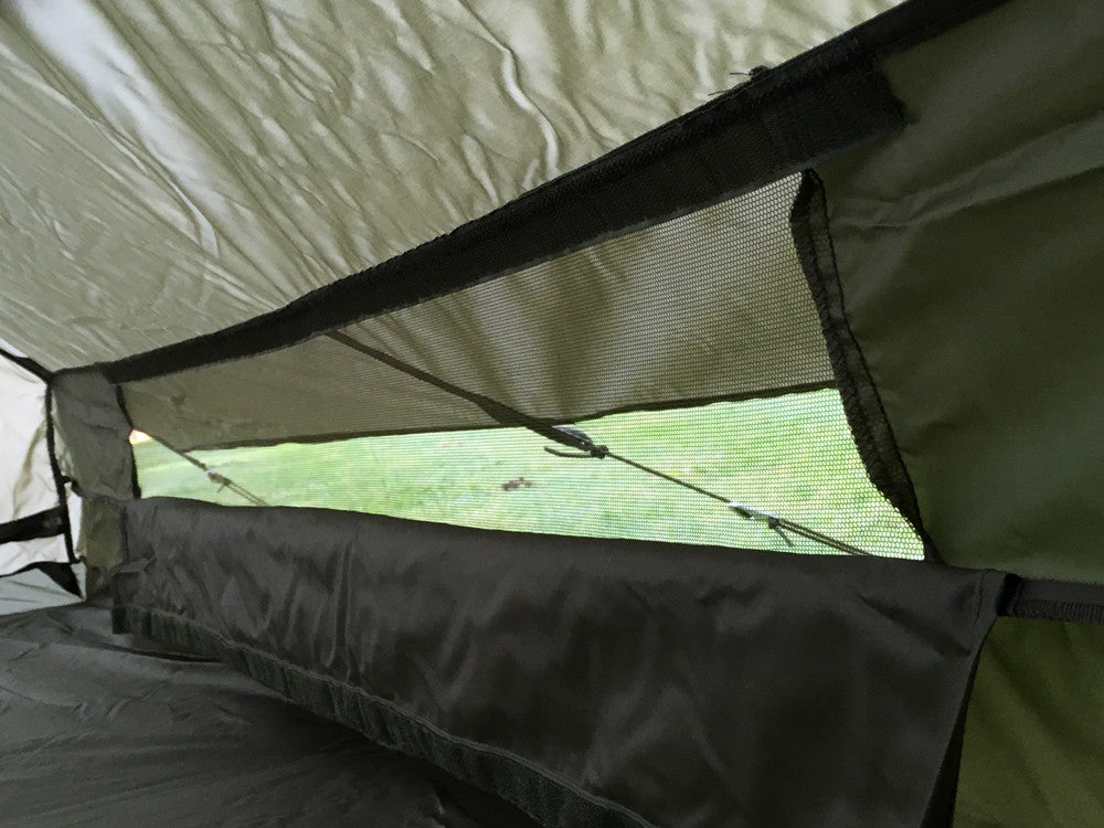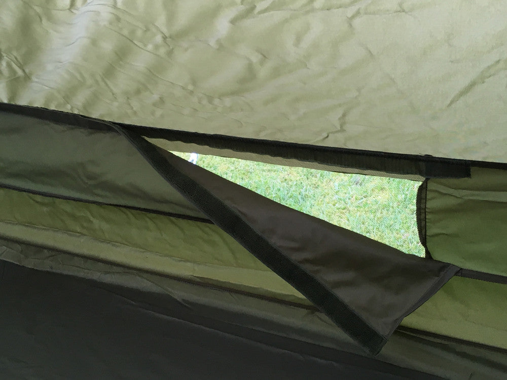 There are triangular net-mesh ventilation panels at the top of the end walls. Along the side walls, there are net mesh strips which have inner Velcro-secured flaps, which can be folded down to help fresh air circulate, as required. The fly-screen mesh helps keep any seasonal varmints out.