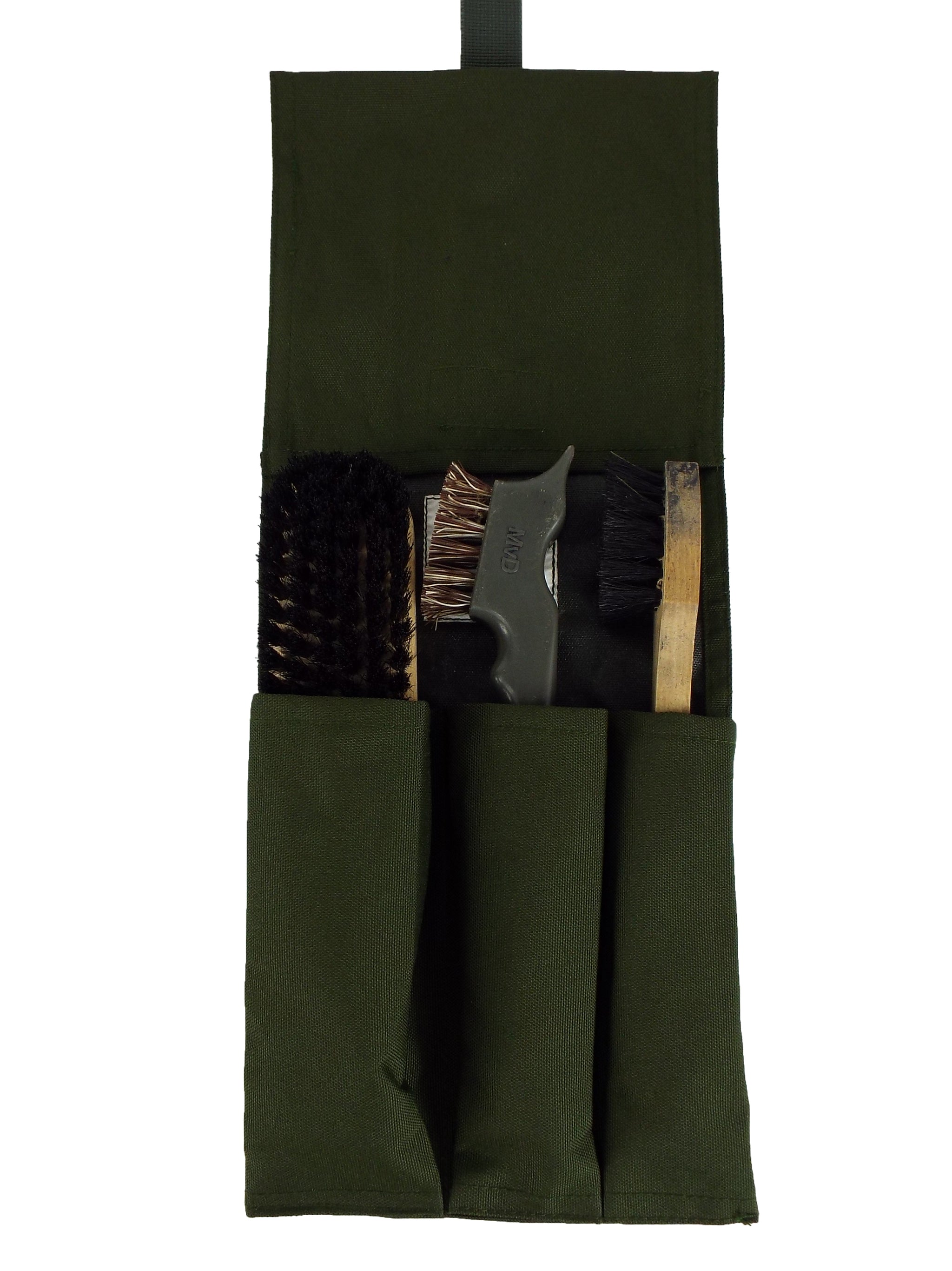 A handy Dutch boot cleaning kit containing three brushes in a carry bag.