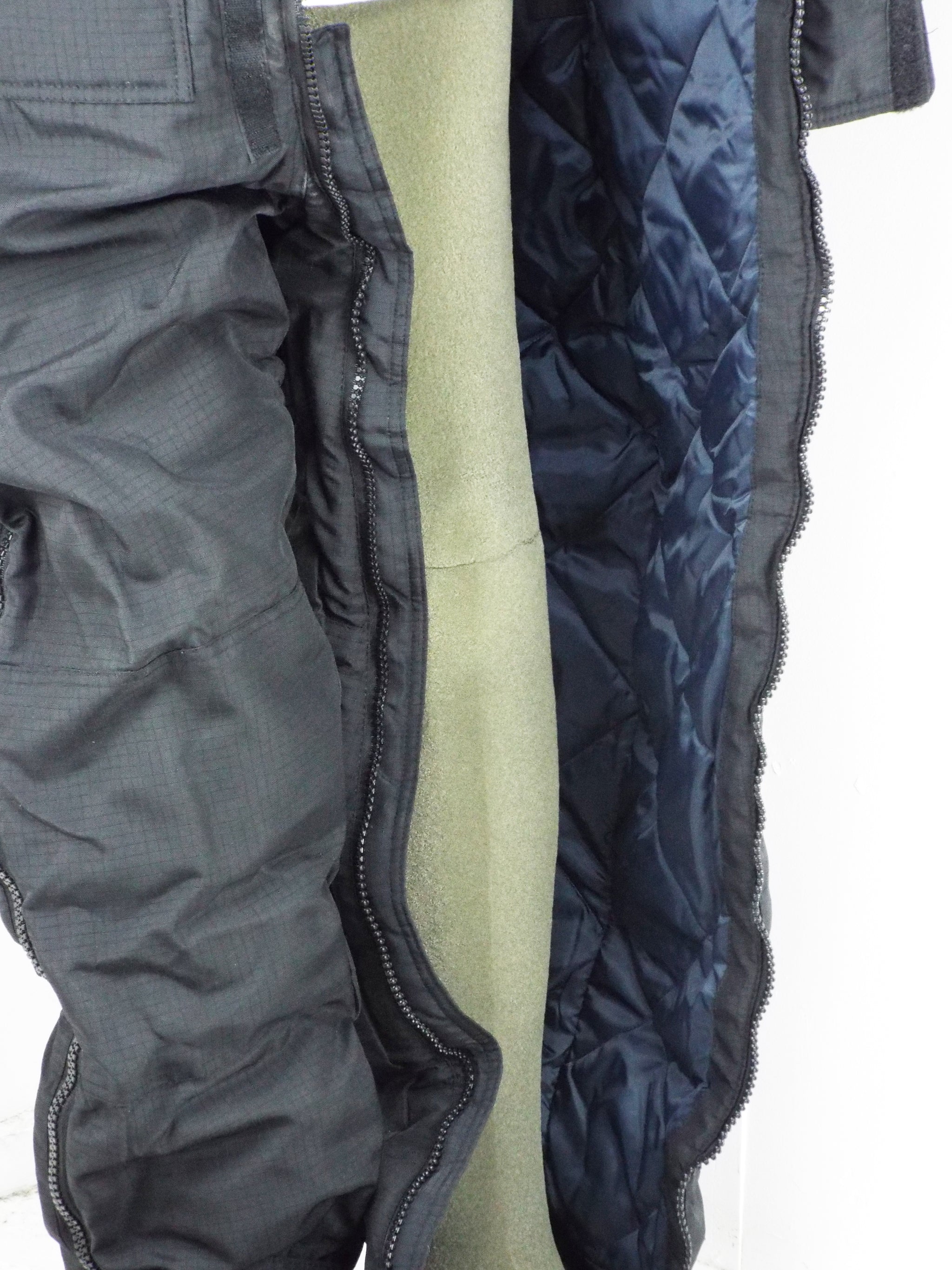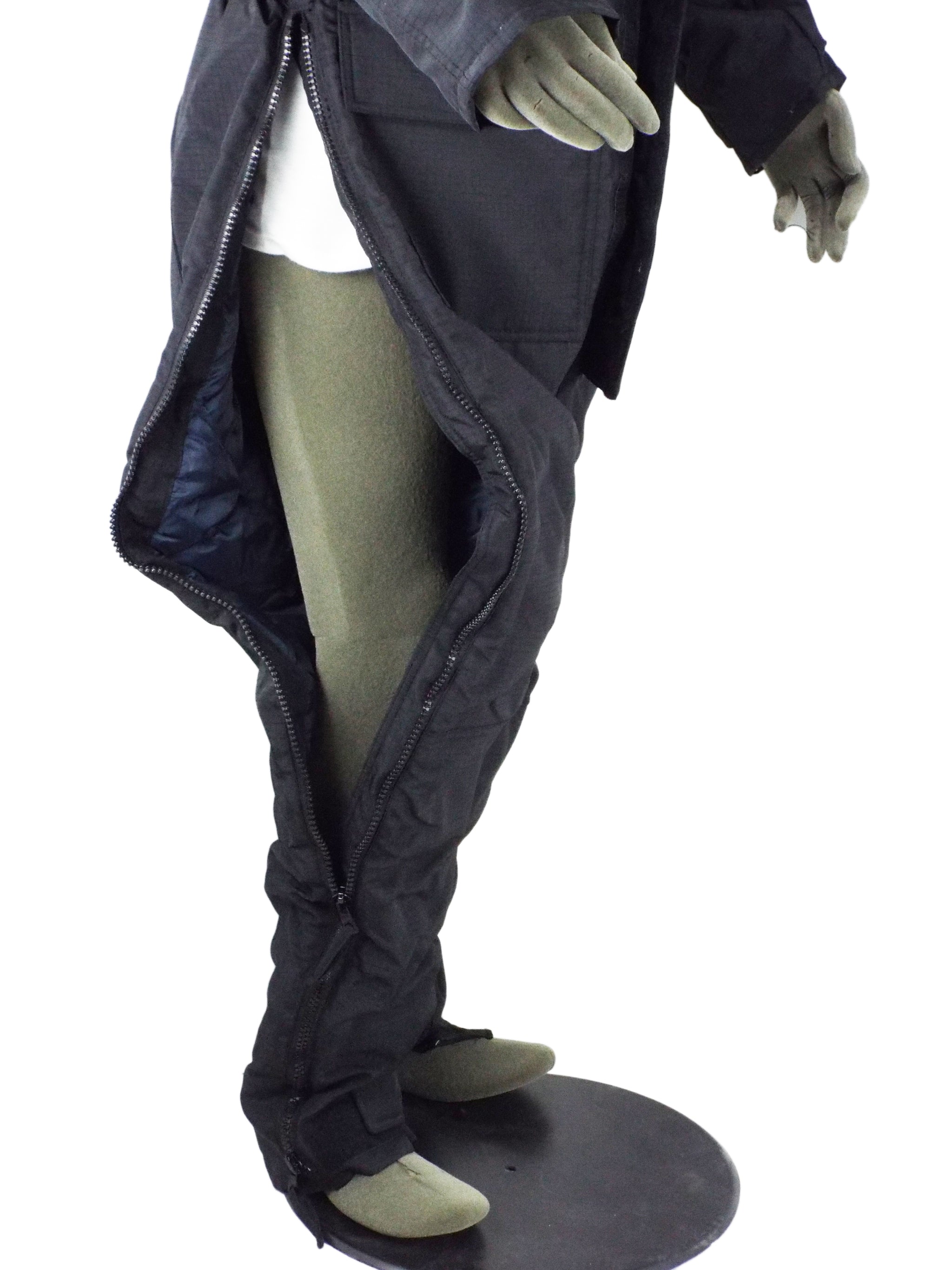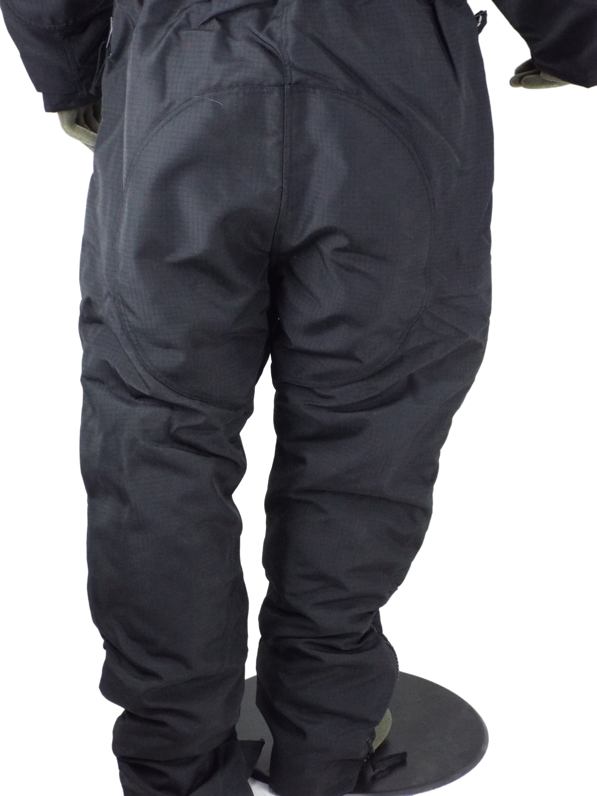 • Full length front zip (with Velcro wind flap). Zip starts at ankle and goes up to neck via the crotch.