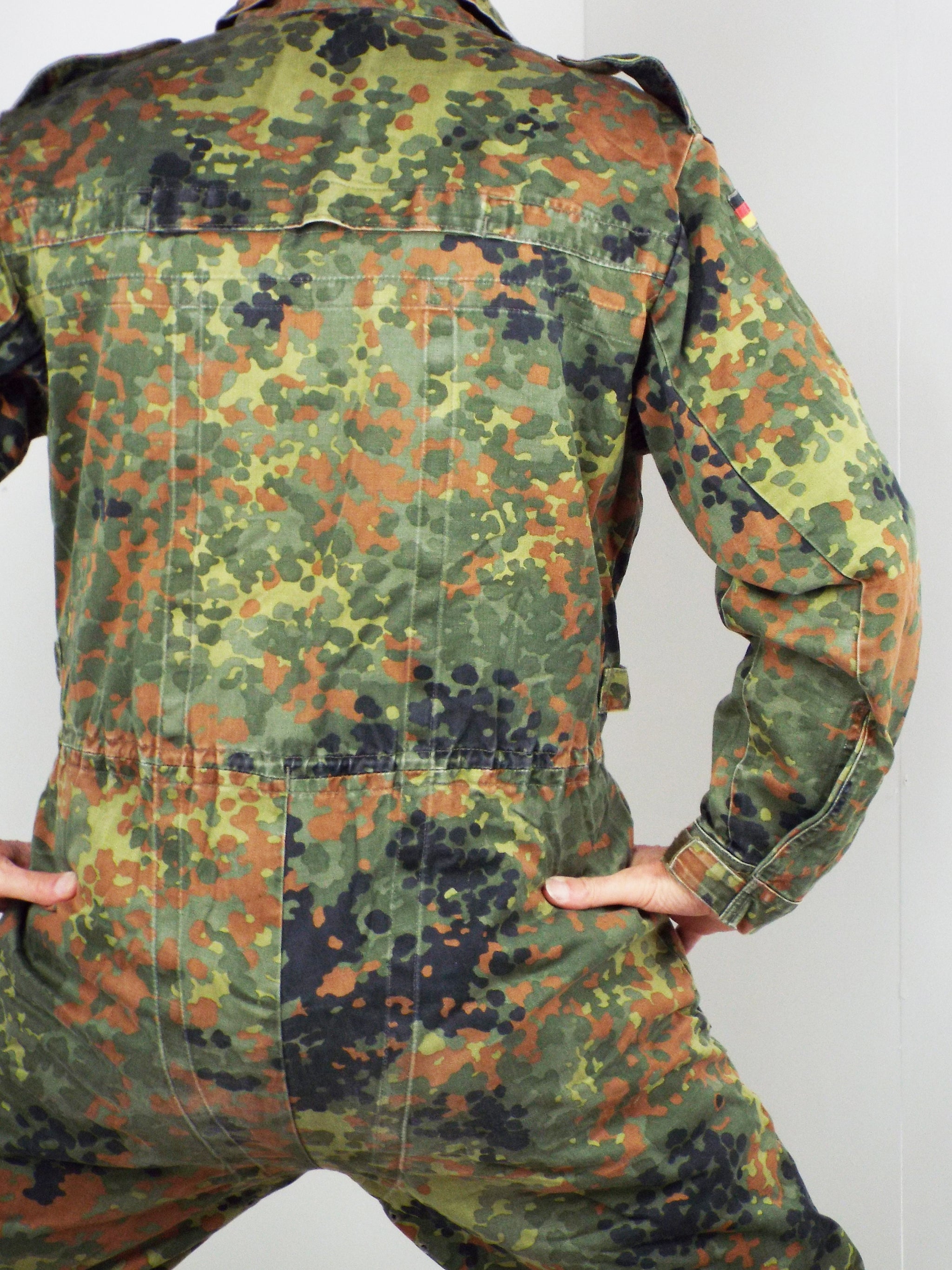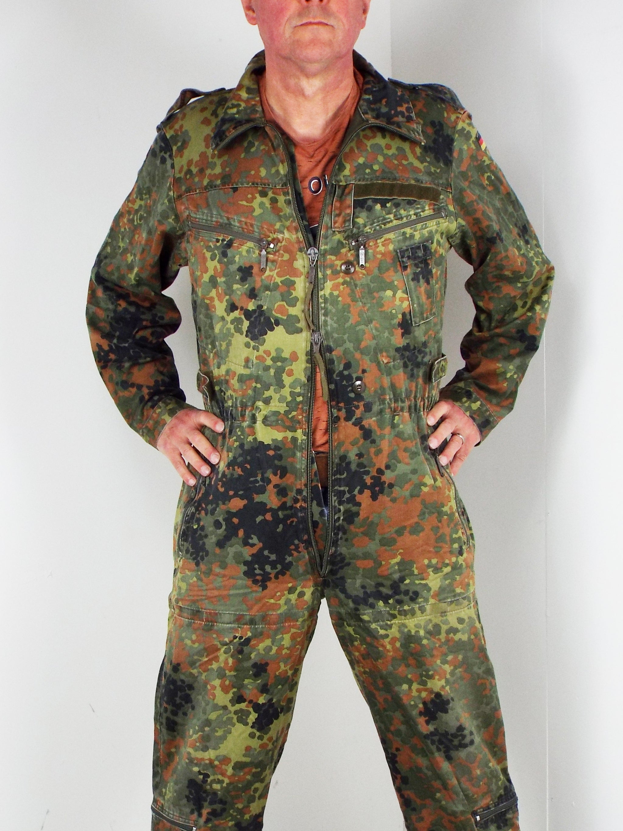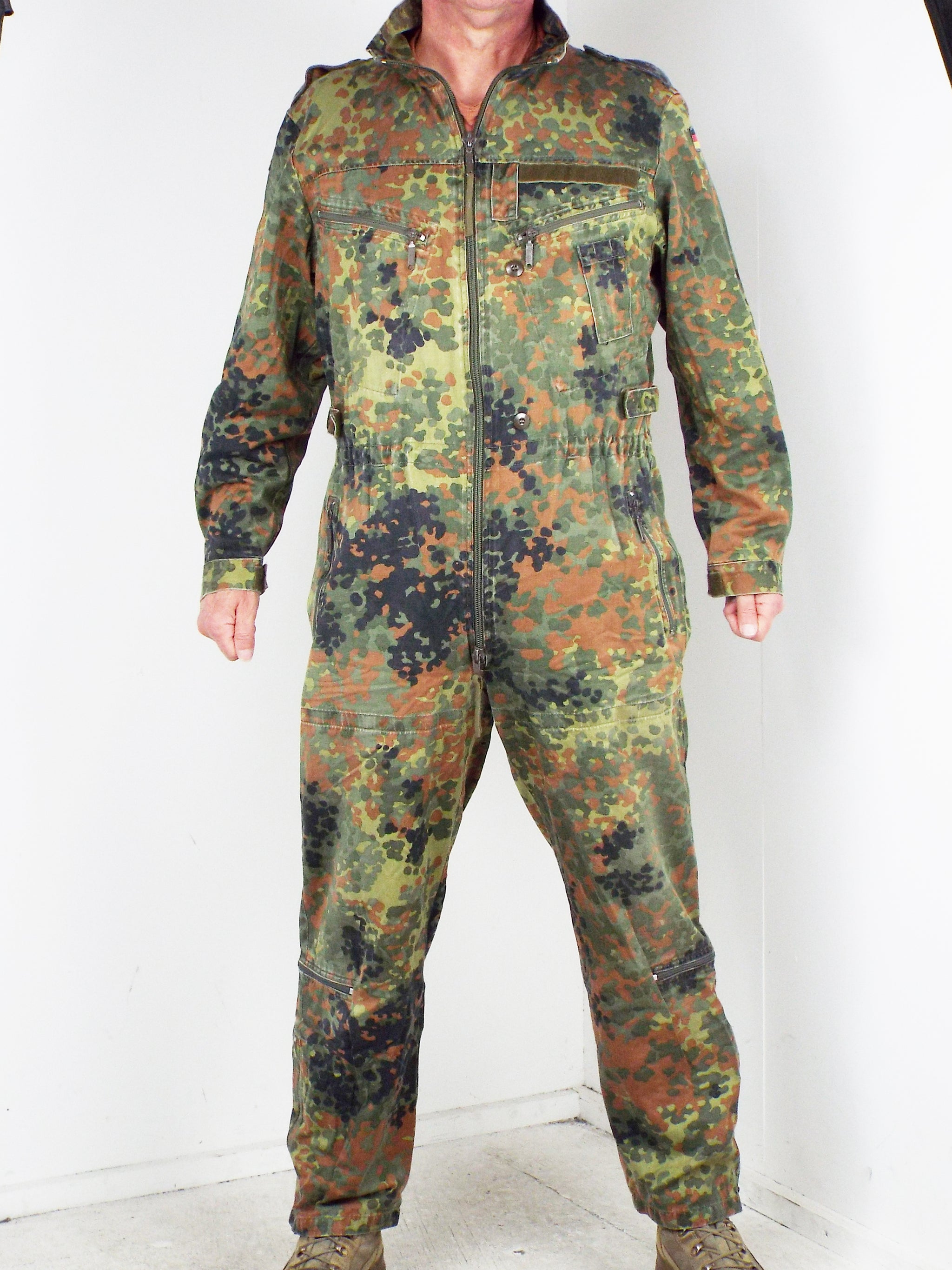 Genuine German military surplus army overalls or more specifically - Tank Suits. Made from heavy-duty poly/cotton, these coveralls are very hard wearing and will take a lot of punishment. They come in German Flecktarn camo pattern with a zip front and shoulder epaulets and make excellent hard wearing overalls for work wear.