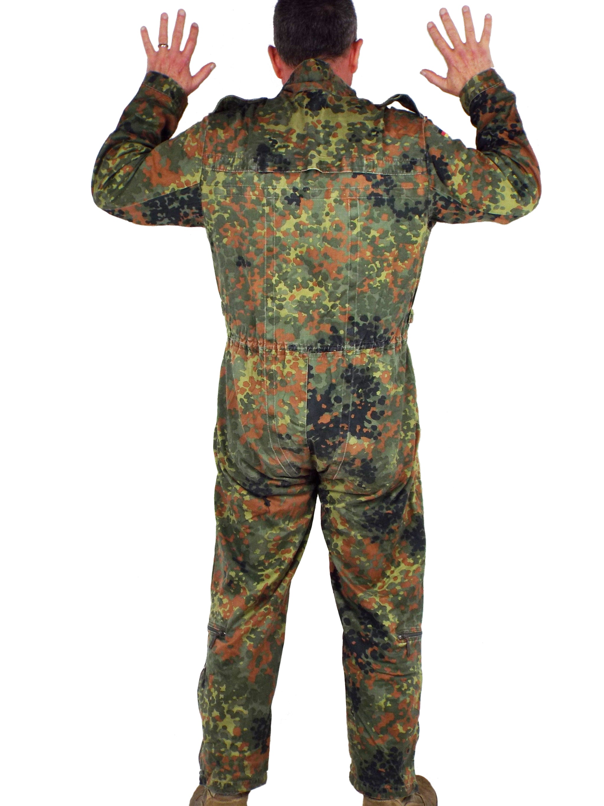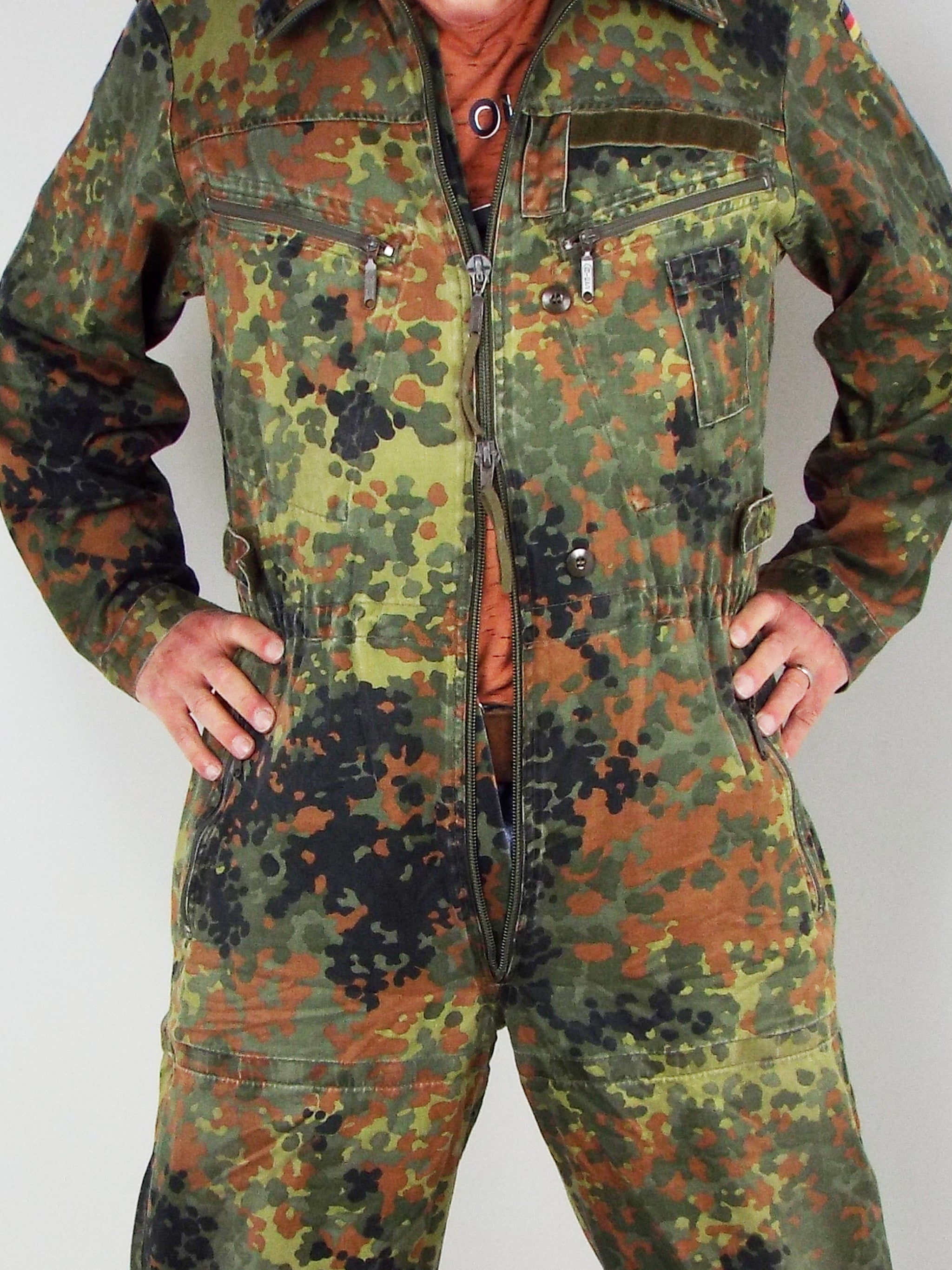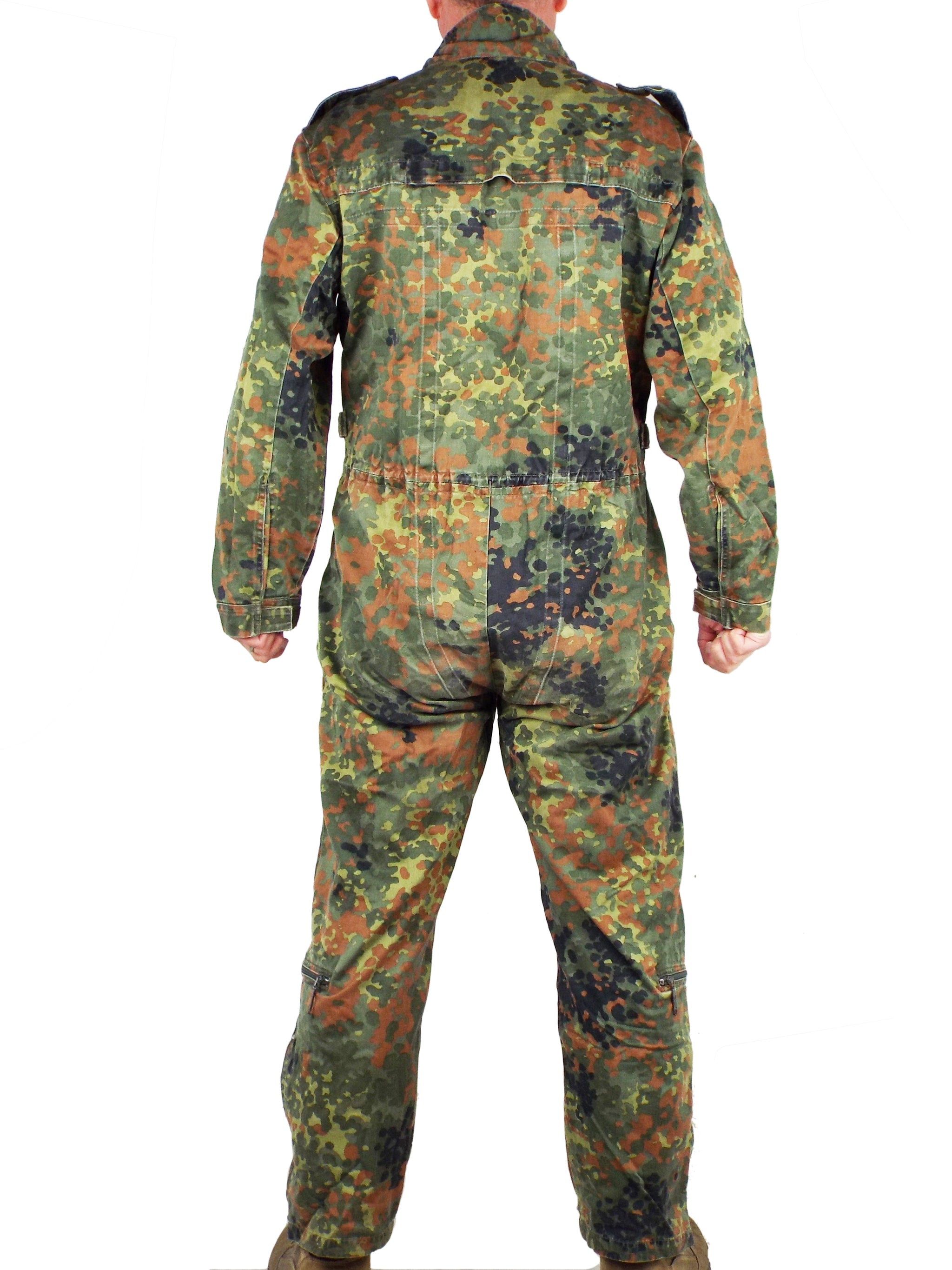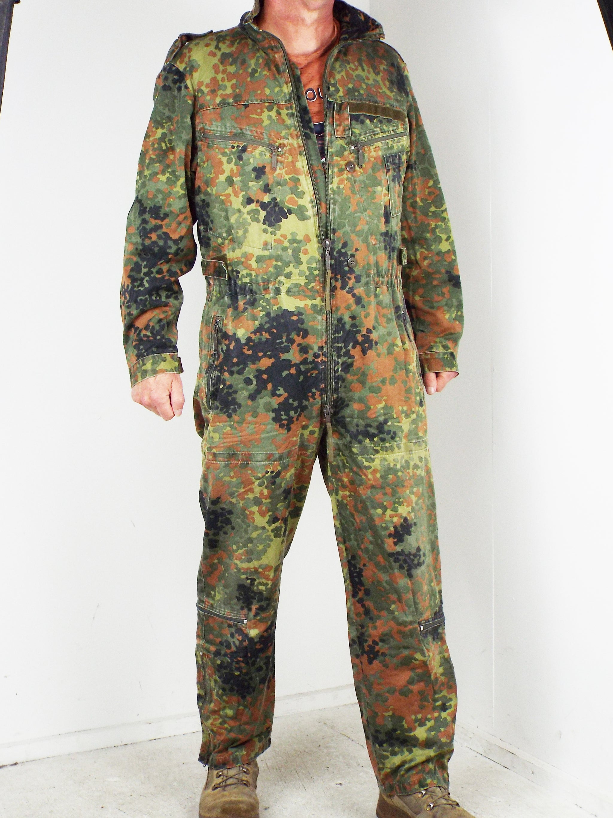 Genuine German military surplus army overalls or more specifically - Tank Suits. Made from heavy-duty poly/cotton, these coveralls are very hard wearing and will take a lot of punishment. They come in German Flecktarn camo pattern with a zip front and shoulder epaulets and make excellent hard wearing overalls for work wear.