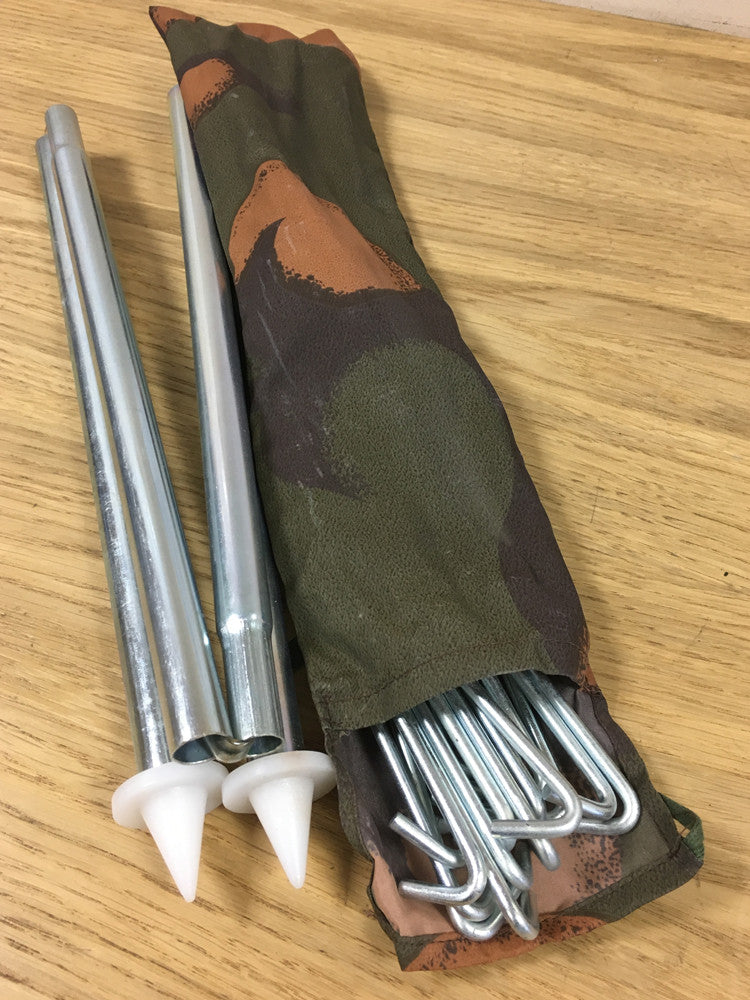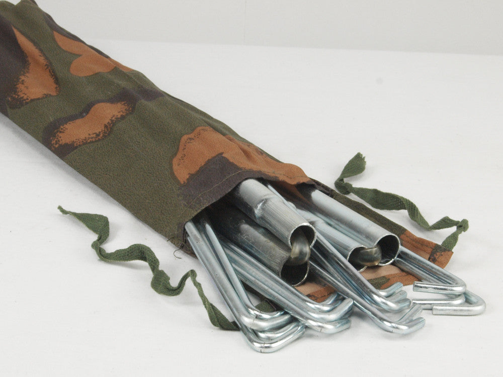 By buttoning the two ponchos together and supporting the fabric, with the single four-piece pole and ground stakes, an approximate 2m x 1.6m x 1.2m tent is created. A genuine military surplus tent from the Hungarian Army, this makes a perfect small tent or shelter for summer camping, fishing, or just for children to play in.