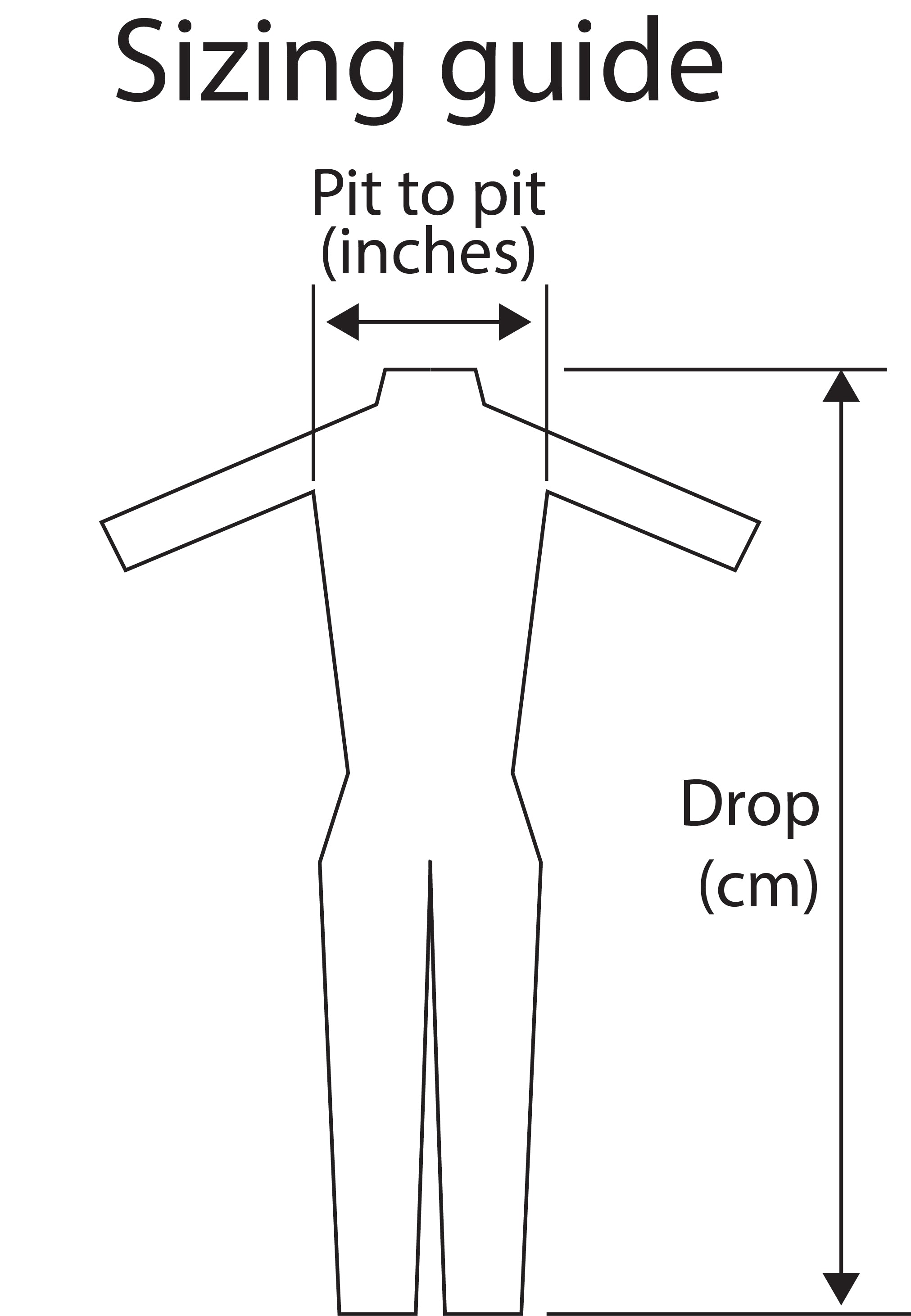 In the size guide we show where the actual measured dimensions of the garments in chest size (inches) and drop (in cm) which displays like this 44/158. So, that garment would be a pit-to-pit size of 44" will fit a chest up to 42" (close fit). And, the drop from collar seam to trouser ankles 158cm. So, measure from the back of your neck to your heel to find the best match in our listing.